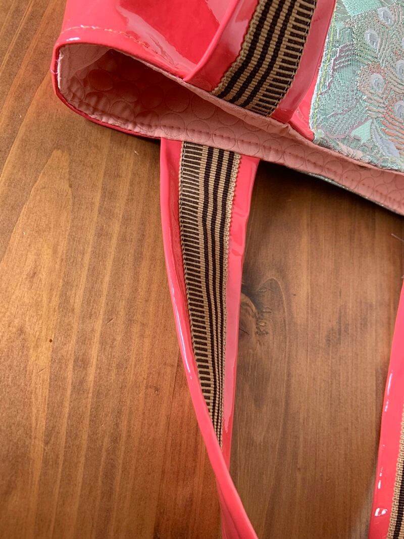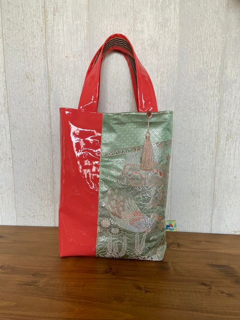 リサイクルの帯とアプリコット色のエナメル生地を合わせて